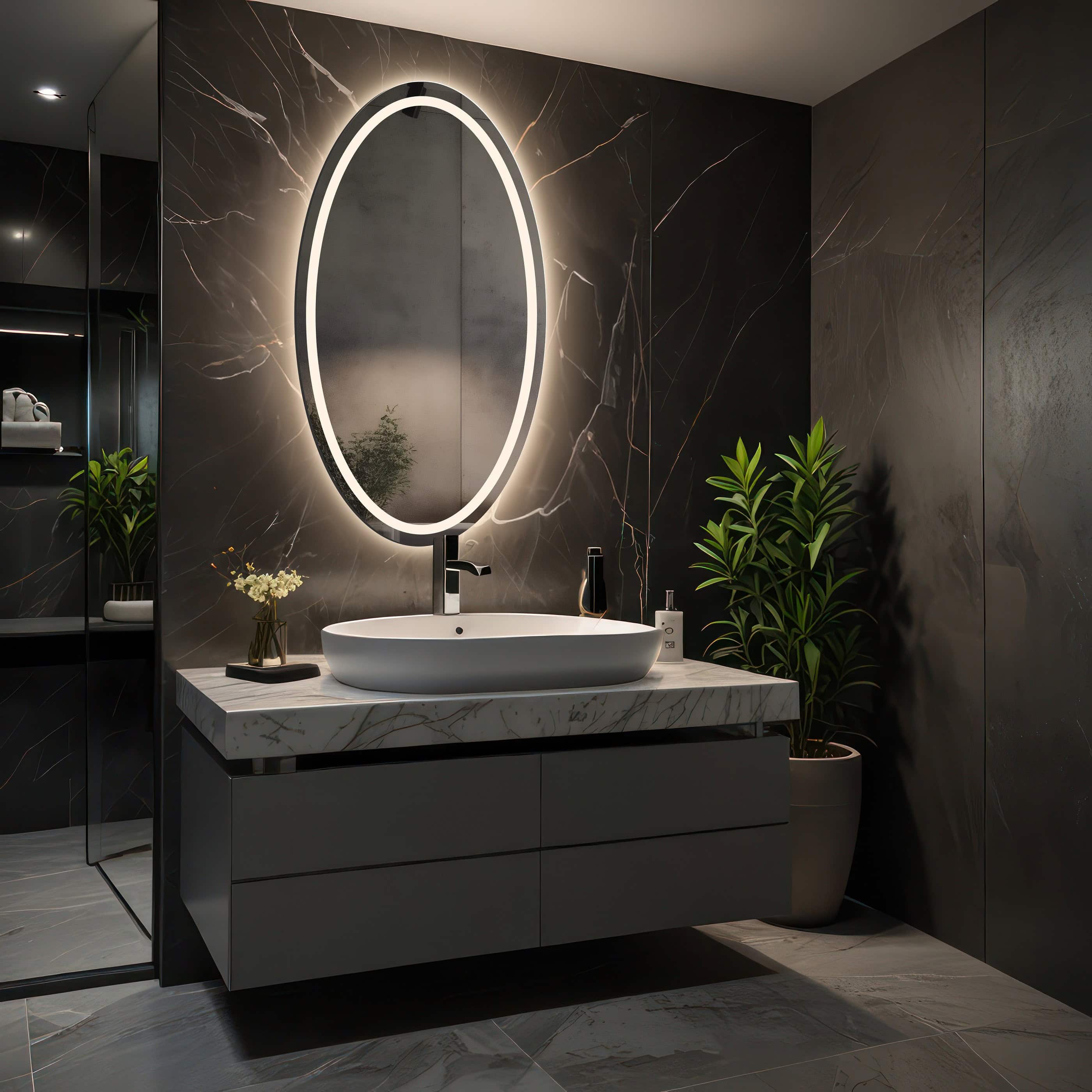 V moderních a minimalistických interiérech jsou vhodnou volbou bezrámová koupelnová zrcadla. Absence dekorací a čisté hrany zrcadlové plochy nebudou s mramorem soupeřit. Pokud k tomu přidáme LED osvětlení, získáme vyšší funkčnost a zdůrazníme moderní charakter prostoru. Pokud jde o zvýraznění, dobrým řešením je zrcadlo s LED páskem umístěným za zrcadlovou plochou. Jemné světlo ji z jedné strany opticky mírně předsadí a z druhé strany zvýrazní žilkování kolem ní. Tento efekt je ještě výraznější u mramorových desek v tmavších odstínech. Pokud jsou světlé nebo bílé, je vhodné věnovat pozornost tomu, co se bude v zrcadle odrážet. Tmavý odraz může způsobit, že zrcadlová plocha bude dominovat pozadí, zejména pokud je velká. Pokud se rozhodneme pro větší koupelnové zrcadlo, lesklá a hladká plocha bude lépe ladit s leštěným mramorem. Přirozeně pórovitý mramor naopak vytvoří matný základ, který je vhodné zvýraznit LED osvětlením.