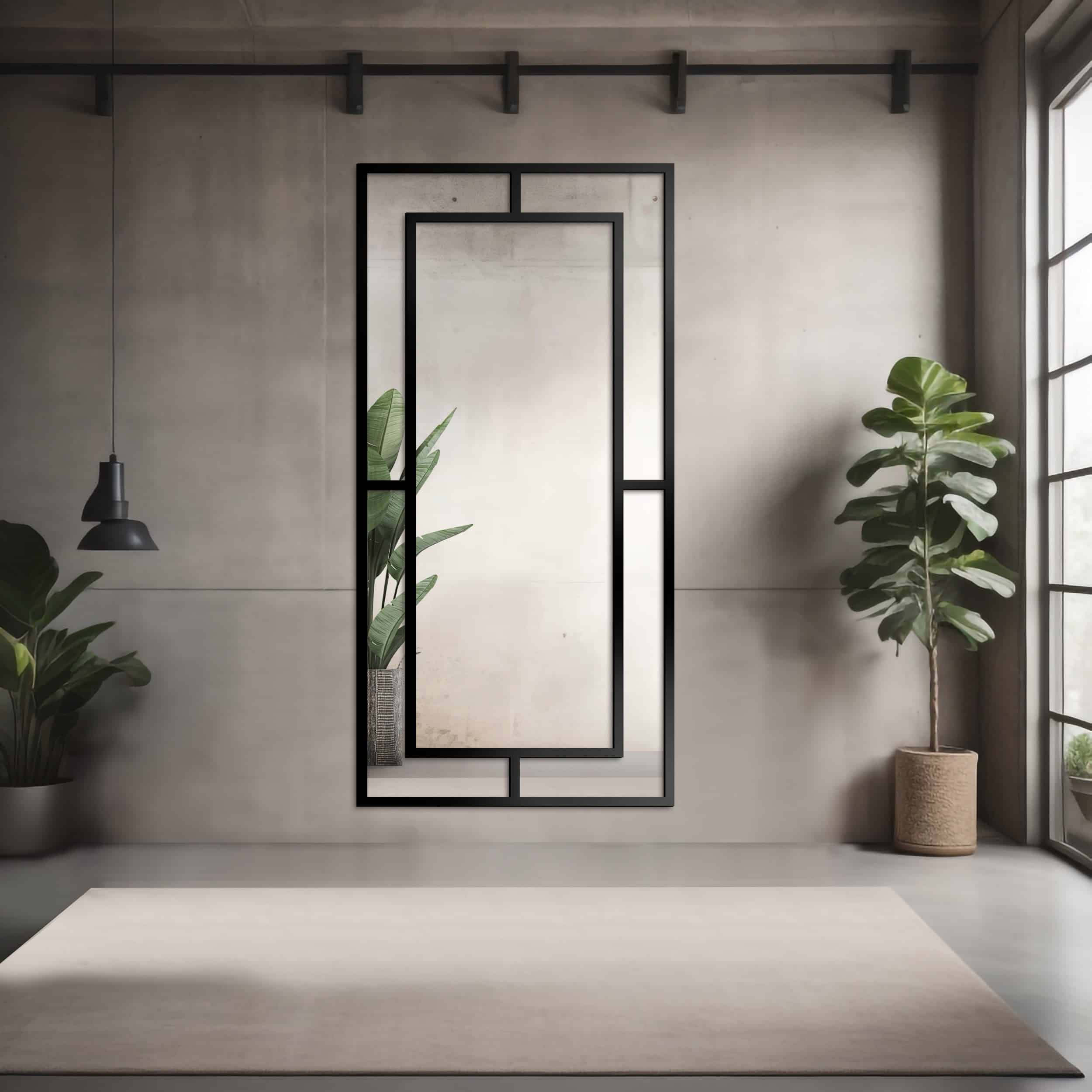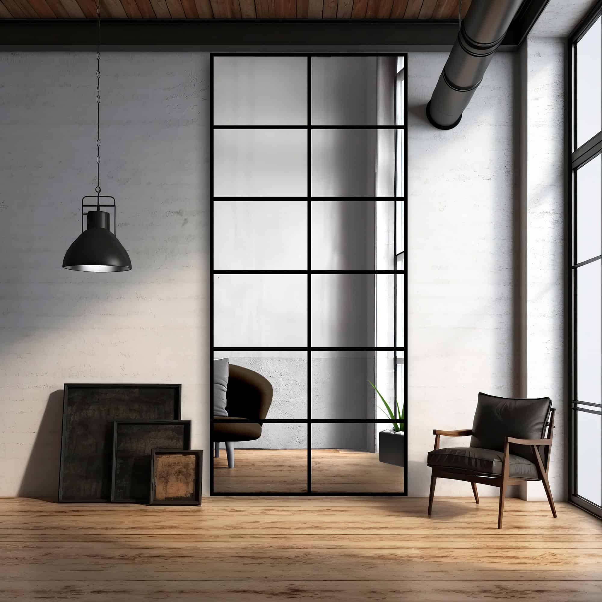 Priečky priamo odkazujú na veľké priemyselné okná. Pripomínajú rôzne presklenia s kovovými prvkami vo fabrikách. Najlepšie je, keď sú čierne. Biele sú príliš jemné a nepôsobia industriálne. Ideálne je, aby bolo takéto industriálne zrkadlo s priečkami čo najväčšie. Malo by mať vertikálnu orientáciu a môže siahať až po strop. Samo osebe opticky predĺži priestor smerom nahor a vhodné usporiadanie priečok to ešte viac zdôrazní.
