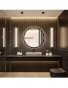 Na fotografii: Okrúhle zrkadlo s priečkami v čiernom matnom loft ráme s podsvietením – LOTIS LED v aranžmá kúpeľne. Zrkadlo na lamelách, ale s priečkami na ploche ukazuje, ako drobnosti môžu spájať a stmeliť kompozíciu. (fot. Alfaram)