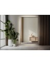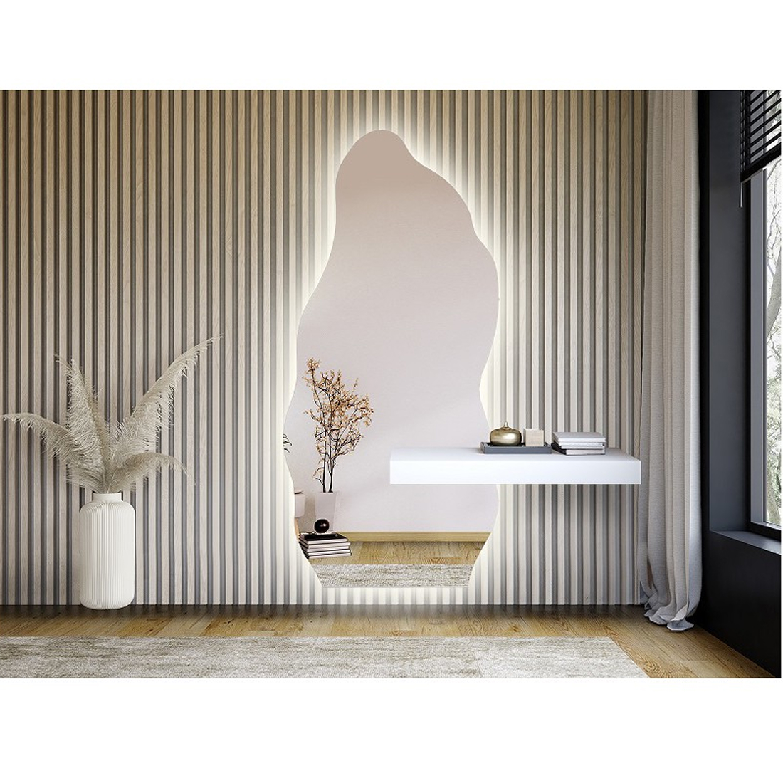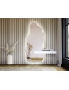 Na fotografii: Zrkadlo nepravidelného tvaru s výrezom na skrinku a podsvietením – AURO 2 LED. Pomerne svetlé, zdanlivo nesúrodé aranžmá, ale práve organické zrkadlo na lamelách sa stáva centrálnym bodom celej steny. (fot. Alfaram)