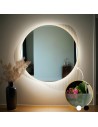 Na fotografii: Zrkadlo na ornamentálnom skle s podsvietením ELEGRA LED – zrkadlová plocha je okrúhla, no sklo za ňou, zvýraznené LED svetlom, má na troch stranách nepravidelný tvar, čo pôsobí veľmi efektne. [fot. ALFARAM]