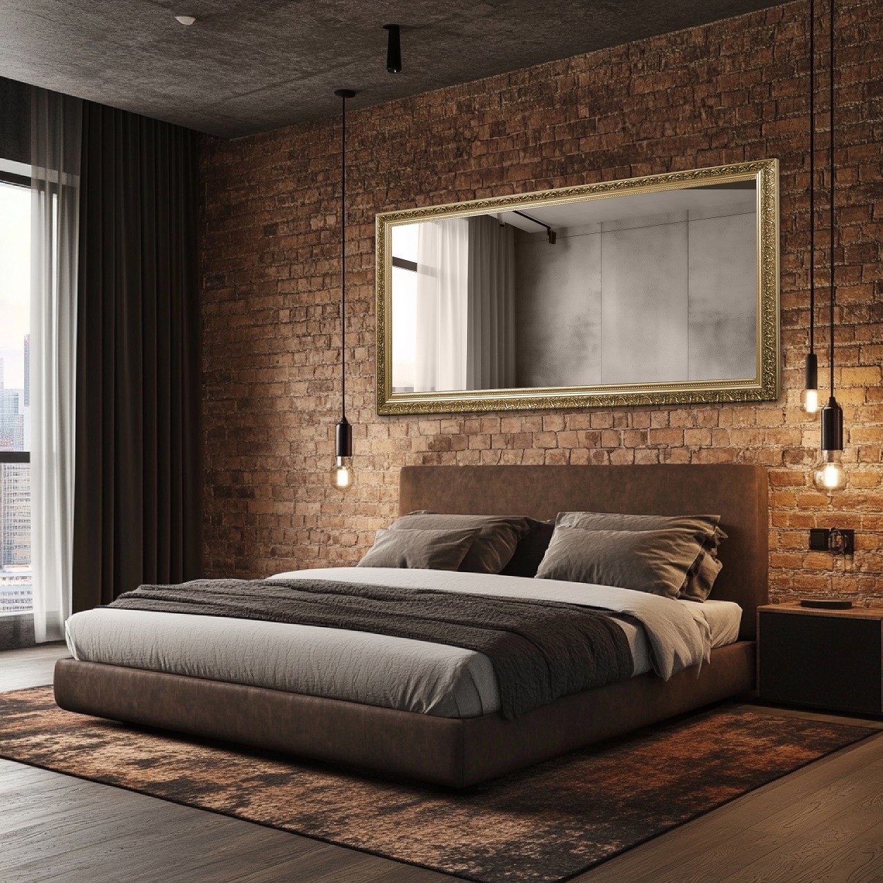 Najpraktickejším riešením v spálni je veľké nástenné zrkadlo, obdĺžnikové alebo oválne, zavesené vertikálne a zobrazujúce celú postavu. Ak sa v miestnosti nachádza toaletný stolík, logickou voľbou je zavesenie zrkadla nad neho. Podobne aj v prípade komody. Bude síce menšie, no postačí na líčenie alebo úpravu účesu. Ide o tri funkčné riešenia, ktoré sú v spálni úplne prirodzené. Nie sú však jediné. Možno sa vydať aj dekoratívnejším smerom a pohrať sa so zrkadlom a jeho umiestnením. Napríklad ho zavesiť nad čelo postele. Veľmi veľké zrkadlo zavesené horizontálne je širšie než čelo postele. Vďaka tomu a ozdobnému rámu sa stáva centrálnym bodom tejto pomerne tmavej aranžácie, do ktorej zrkadlová plocha vnáša jemný lesk.