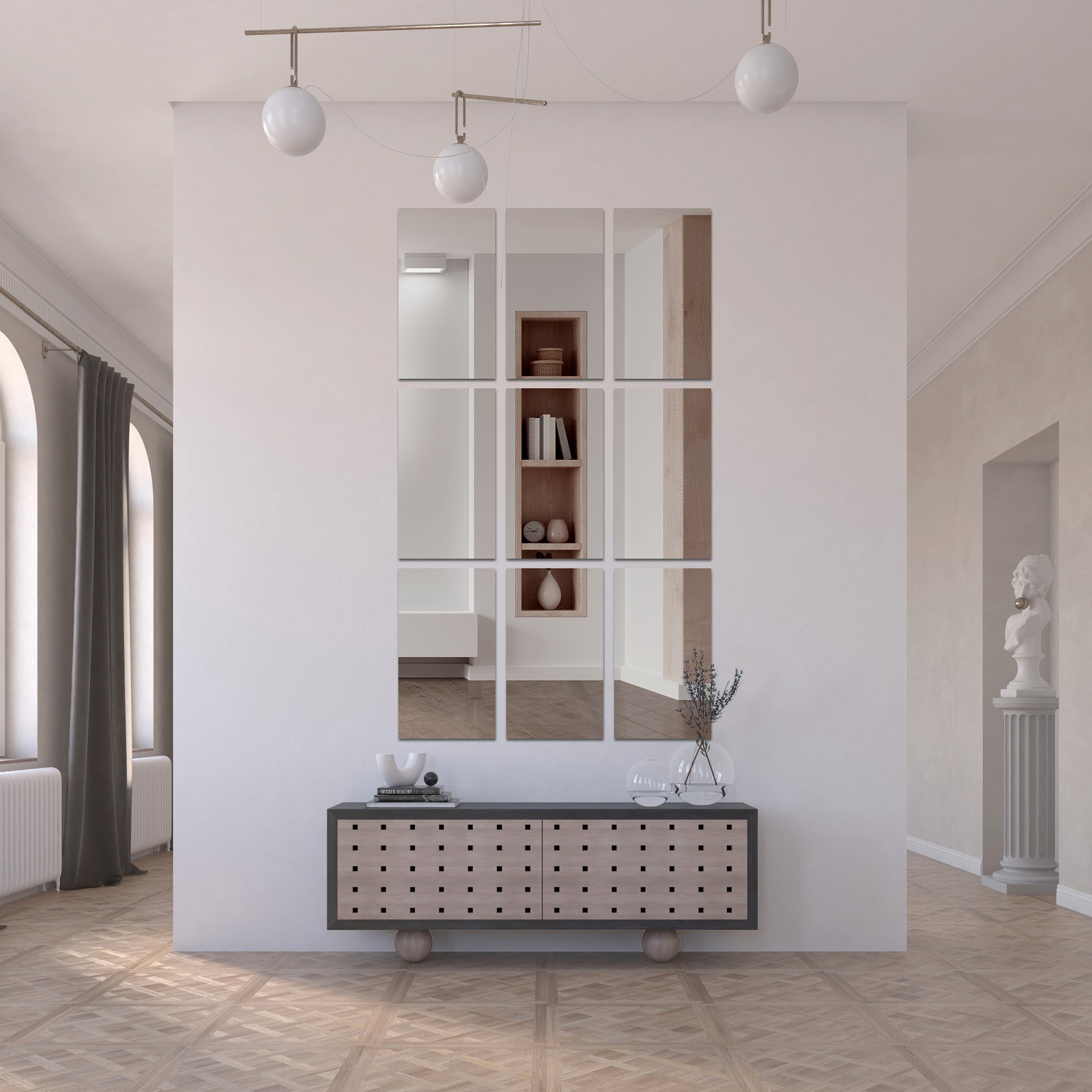 Zrkadlové dlaždice môžu mať tradičný obdĺžnikový alebo štvorcový tvar, ale aj okrúhly či hexagonálny. Ich veľkou výhodou je možnosť ukladať ich rôznymi spôsobmi a vytvárať rozličné vzory. Vznikajú tak efektné kompozície, ktoré okamžite priťahujú pozornosť, hoci v spálni to nemusí byť hlavným cieľom.