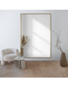 Podobný charakter má interiér s obdĺžnikovým zrkadlom v minimalistickom ráme 1201 a minimalistickou úpravou. Ostatné tvary zase odkazujú na plynulé línie a sušené kvety, vetvičky a vázy na prírodu. Dodatočný prvok asymetrie vnáša drevená podlaha v tvare rybieho chrbta, ktorá zároveň trochu zatepľuje priestor. Dominujú svetlé farby a zemité odtiene prerušené jednoduchým čiernym rámom, ktorý jemne kontrastuje s bielou stenou. Je to dobrý základ na to, aby ste sem pridali niekoľko drobných doplnkov v farbe rámu. Stojí za to dodať, že zrkadlá v rámoch sa hodia k wabi sabi, ale rámy by mali byť hladké a jednoduché a ich vzhľad čo najprirodzenejší. Harmonizujú s filozofiou akceptácie prirodzenosti, nedokonalosti a jednoduchosti. Minimalistická forma zrkadla nepreťažuje interiér, odráža okolie, dodáva mu hĺbku a odráža svetlo pokoja, čo zapadá do idey tohto štýlu. Minimalistické sú aj zrkadlá bez rámu, ako v prípade predchádzajúcej úpravy s modelom ANTIK. Podobne ako všetky, ktoré nemajú zbytočné prvky a ozdoby, čo zapadá do snahy o jednoduchosť.