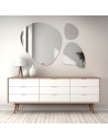 Na obrázku: Súprava troch zrkadiel s nepravidelným tvarom FLORA s jednoduchou komodou a dvoma doplnkami, ktoré spolu tvoria minimalistickú aranžáciu v modernom štýle [fot. ALFARAM]