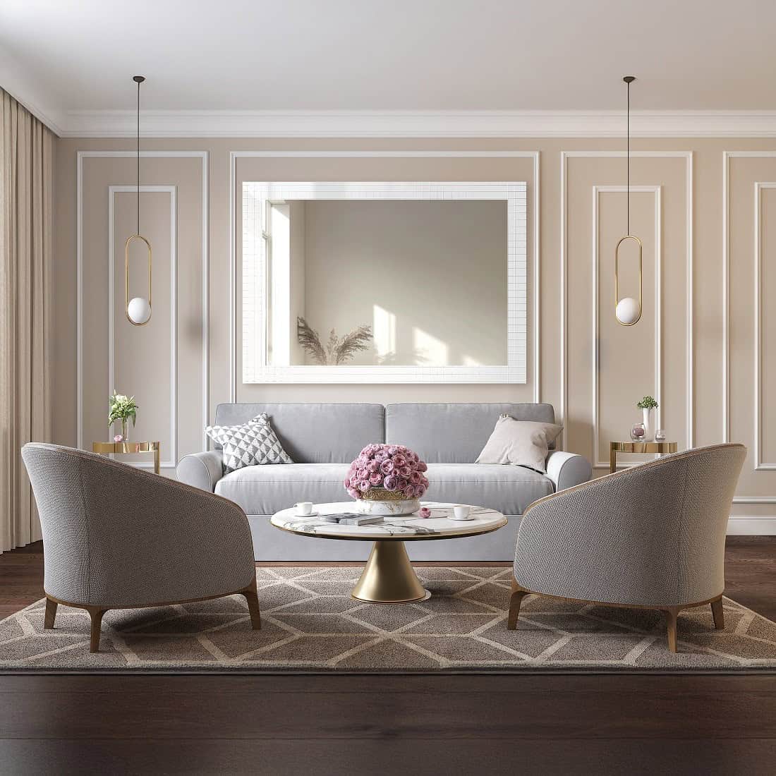 Nazývajú sa rôzne – rámiky alebo panely, ktoré vytvárajú pozadie pre zrkadlá. Najčastejšie sa vyrábajú zo štukatúrnych líšt, aby vytvorili ozdobný rám okolo zrkadlovej plochy. Kompozícia by mala byť presne naplánovaná. Ak máme aj stropné a soklové lišty, oplatí sa dbať na jednotnosť v celom interiéri, aby sa dosiahol harmonický efekt. Určite ho podčiarkne výber vhodného zrkadla, konkrétne jeho tvar alebo vzhľad rámu.