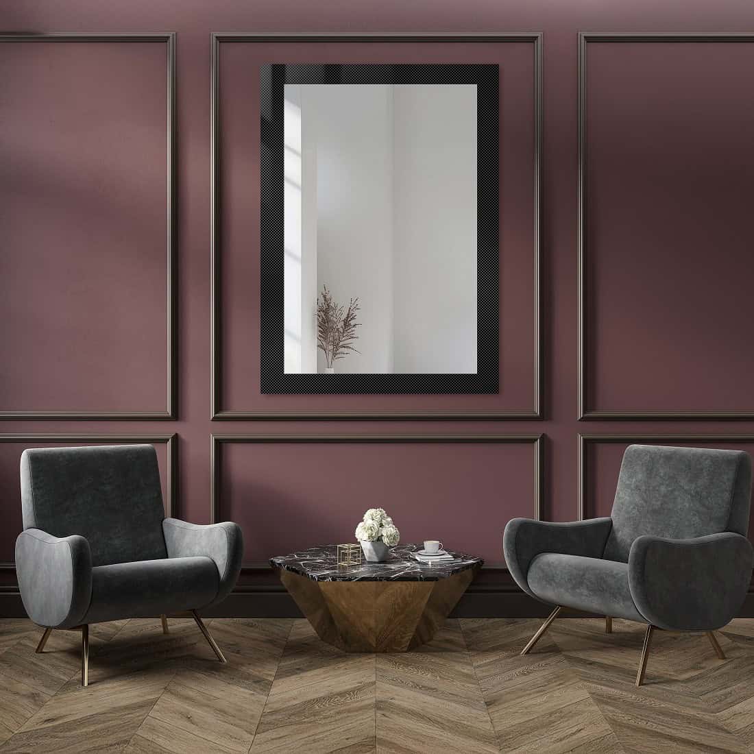 Ak vytvárame obdĺžnikový rám alebo štvorcový panel, oplatí sa zvoliť zrkadlo rovnakého tvaru. Ide o kompozíciu, v ktorej zrkadlo v štukatúre vypĺňa celý priestor vo vnútri panelu, ktorý sa preň stáva viac či menej dekoratívnym rámom. Jednoduchým a moderným alebo bohatým so zdobnými profilmi. Vtedy si možno vybrať zrkadlovú plochu bez rámu alebo s LED podsvietením, prípadne využiť LED štukatúru. Svetlo – či už pri zrkadle alebo pri lištách – zvýrazní ich vzor a lesk zrkadlovej plochy.