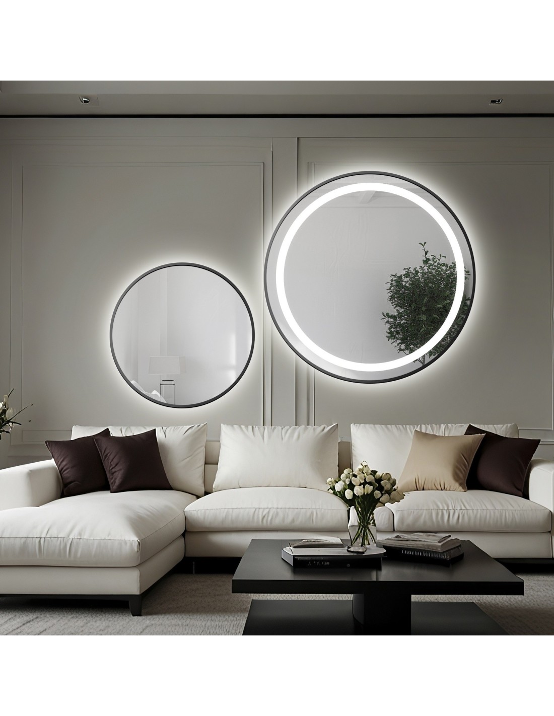 Súprava pieskovaných okrúhlych zrkadiel v čiernom MDF ráme SLIM s podsvietením STELLA LED - farba rámu na výber