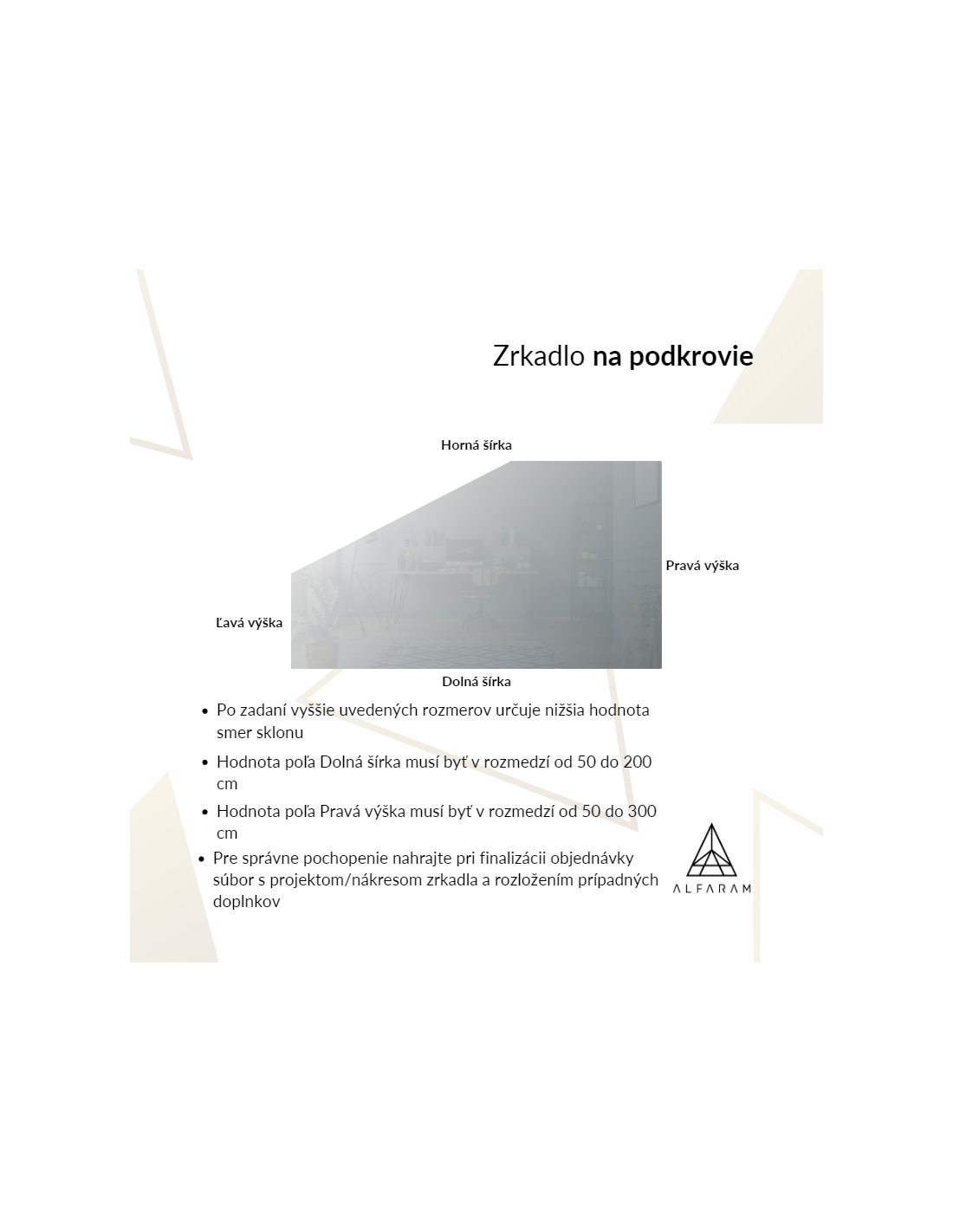 Ak ste nenašli požadovanú veľkosť zrkadla alebo potrebujete iné rozdelenie - kontaktujte nás telefonicky alebo e-mailom. Najväčšie zrkadlá, ktoré dokážeme vyrobiť, sú 200x300 cm a okrúhle zrkadlá s priemerom 200 cm. Zrkadlá vyrábame na individuálnu objednávku. Vyzývame vás, aby ste nám poslali svoju požiadavku spolu s projektom na e-mailovú adresu zrkadlá@alfaram.sk