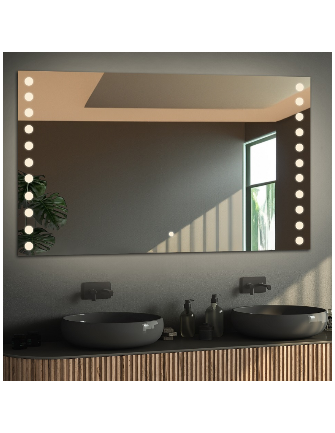 * Zrkadlo má na zrkadlovej ploche mliečny pieskovaný pás LED. Šírka mliečne pieskovaného pásu sa volí podľa rozmerov zrkadla