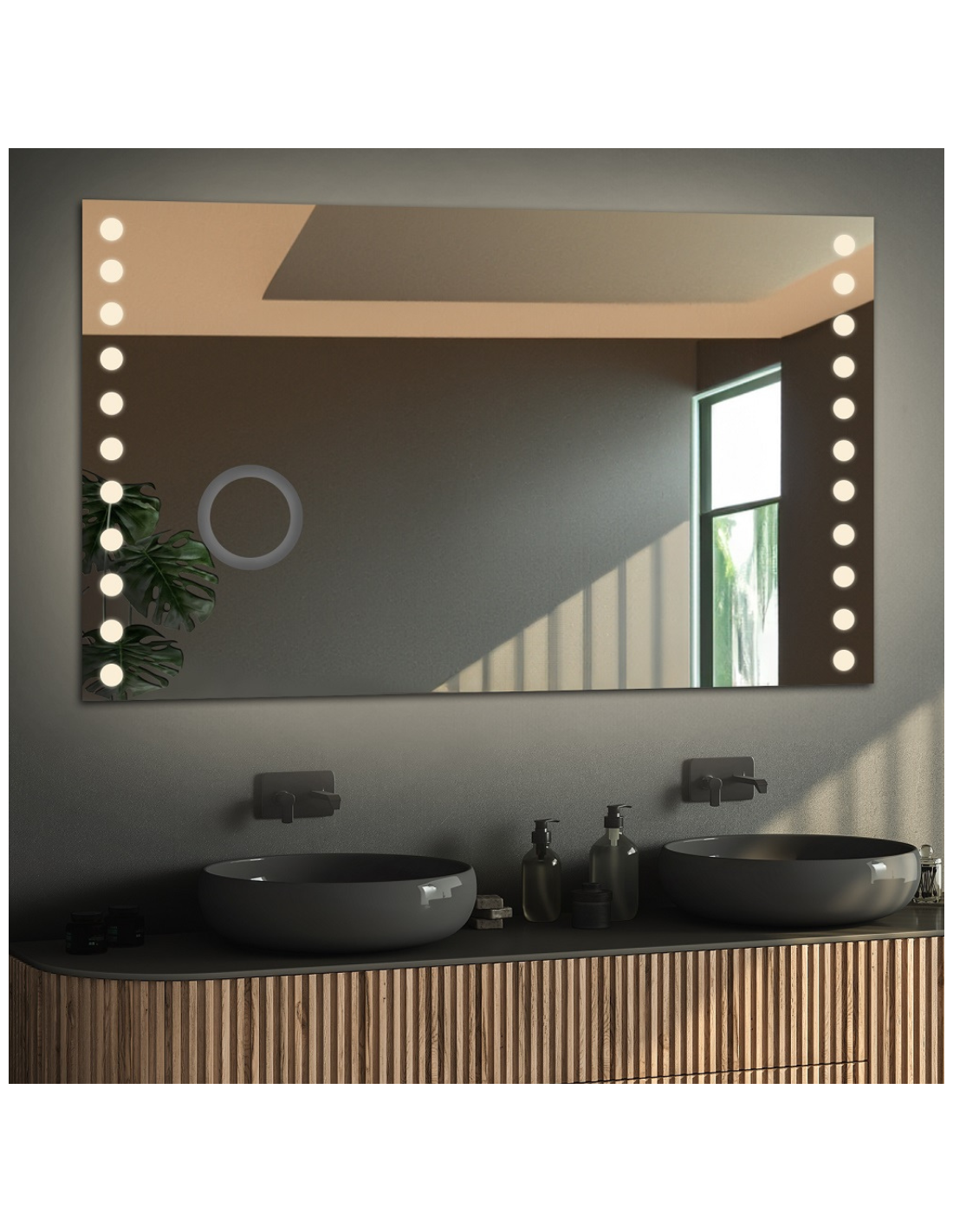 Zrkadlo ZOOM - Toto zväčšovacie zrkadielko vstavané do hlavného zrkadla je ideálnym nástrojom pre tých, ktorí si potrpia na detaily. Navrhnuté bolo s dôrazom na pohodlie a funkčnosť. ZOOM zrkadielko ponúka trojnásobné zväčšenie obrazu, čo umožňuje presné nanášanie make-upu, holenie či vykonávanie presných ošetrujúcich úkonov. Zväčšovacie zrkadlo nemá dodatočné osvetlenie. Celkový priemer zrkadielka je 14 cm = (12 cm stred + 1 cm z oboch strán tvorí dekoratívny mliečny pásik).