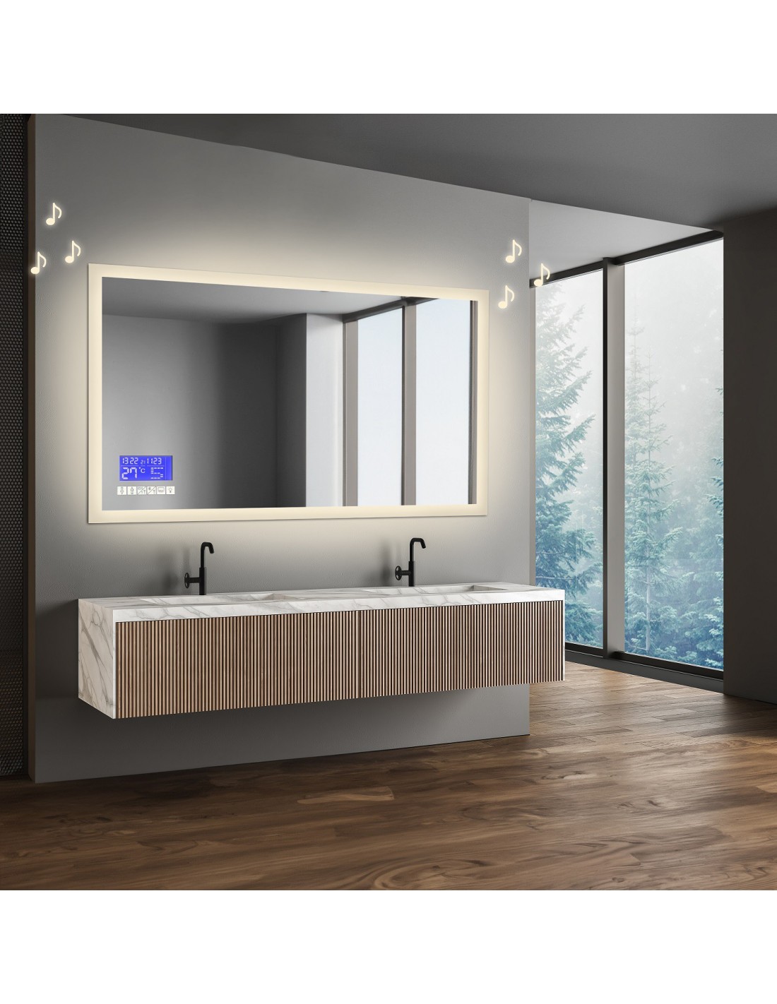 Meteostanica je vybavená dátumom, zobrazením času a teplotným senzorom, nočným režimom a 2,4 GHz WiFi. Stanica je osvetlená nezávisle od osvetlenia zrkadla. Stanica sa nastavuje z aplikácie pre iOS/Android. Meteostanica svieti na modro.