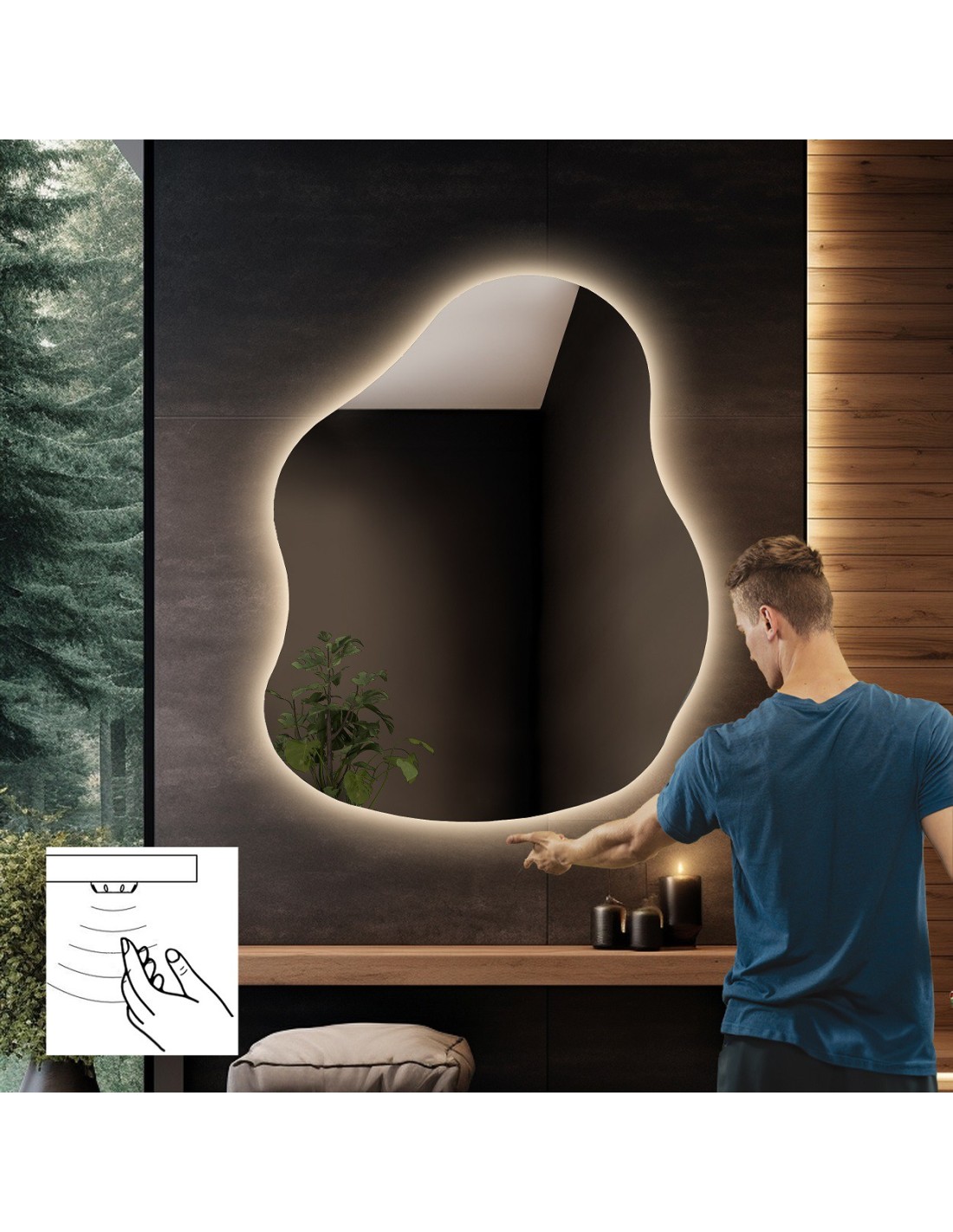 Senzorový spínač so stmievaním - Táto možnosť umožňuje zapnutie a vypnutie osvetlenia zrkadla bez fyzického kontaktu, pohybom ruky v blízkosti snímača. Pre správnu prevádzku by sa v okruhu približne 15 cm od snímača nemali nachádzať žiadne prekážky, ktoré by mohli rušiť IR lúč.