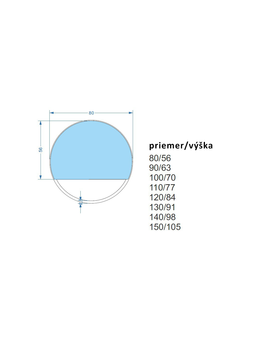 Štandardné rozmery zrkadiel: priemer 50 cm, priemer 60 cm, priemer 70 cm, priemer 80 cm